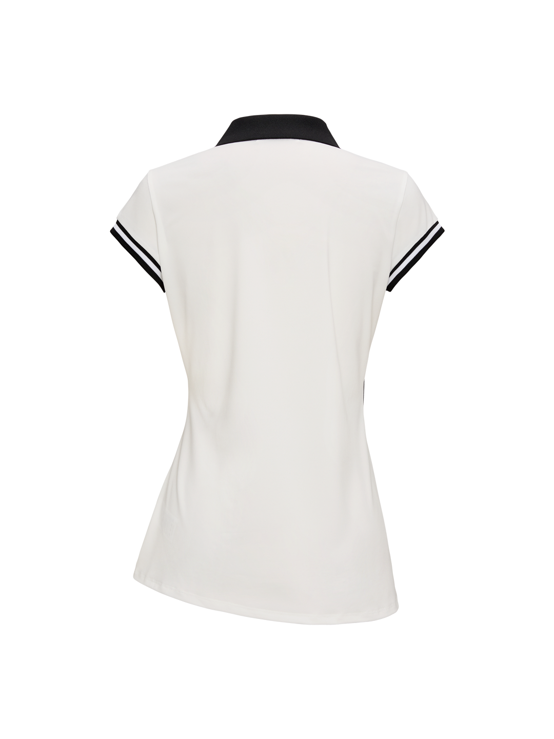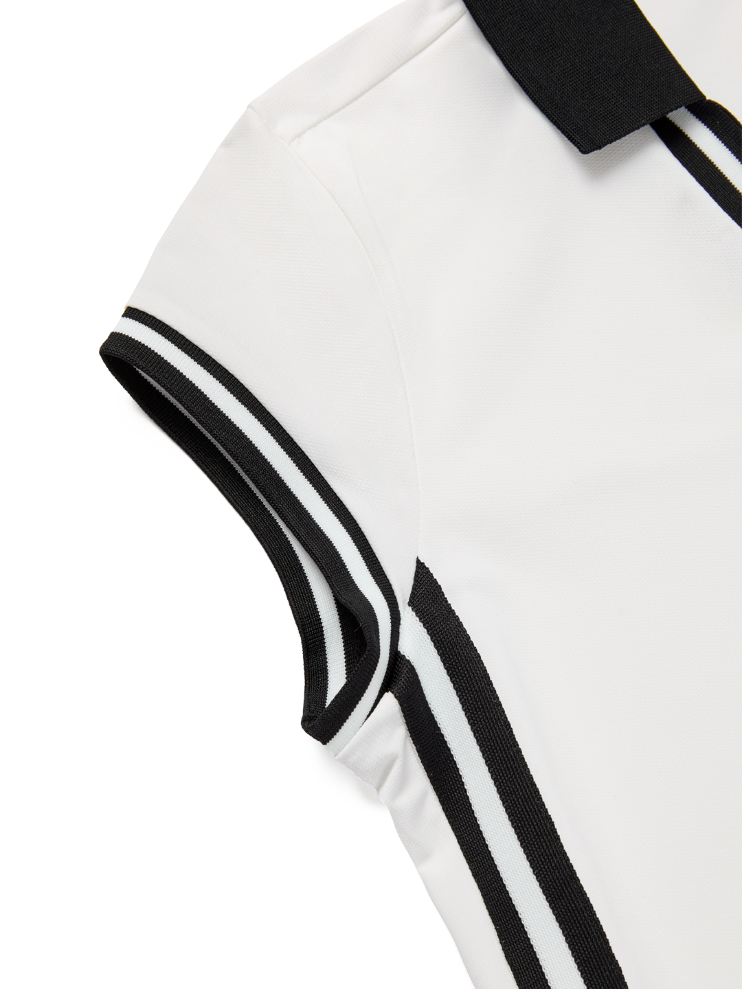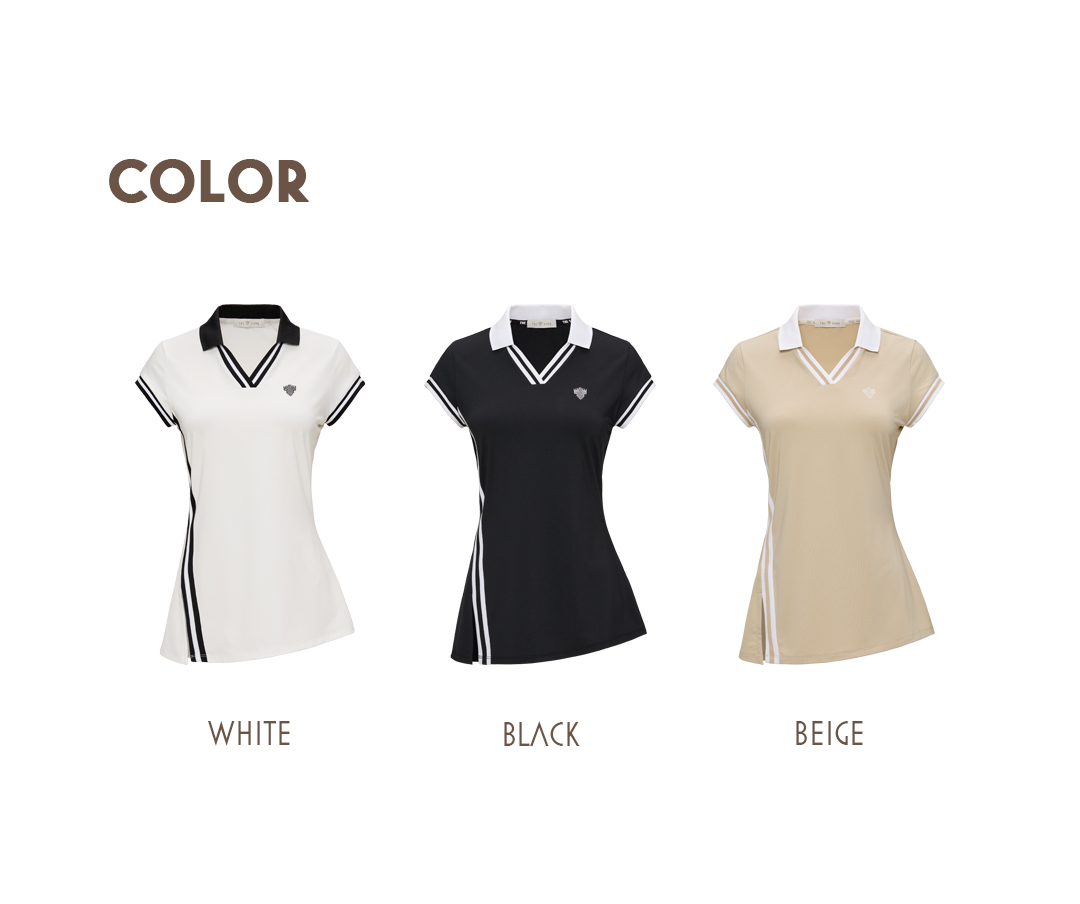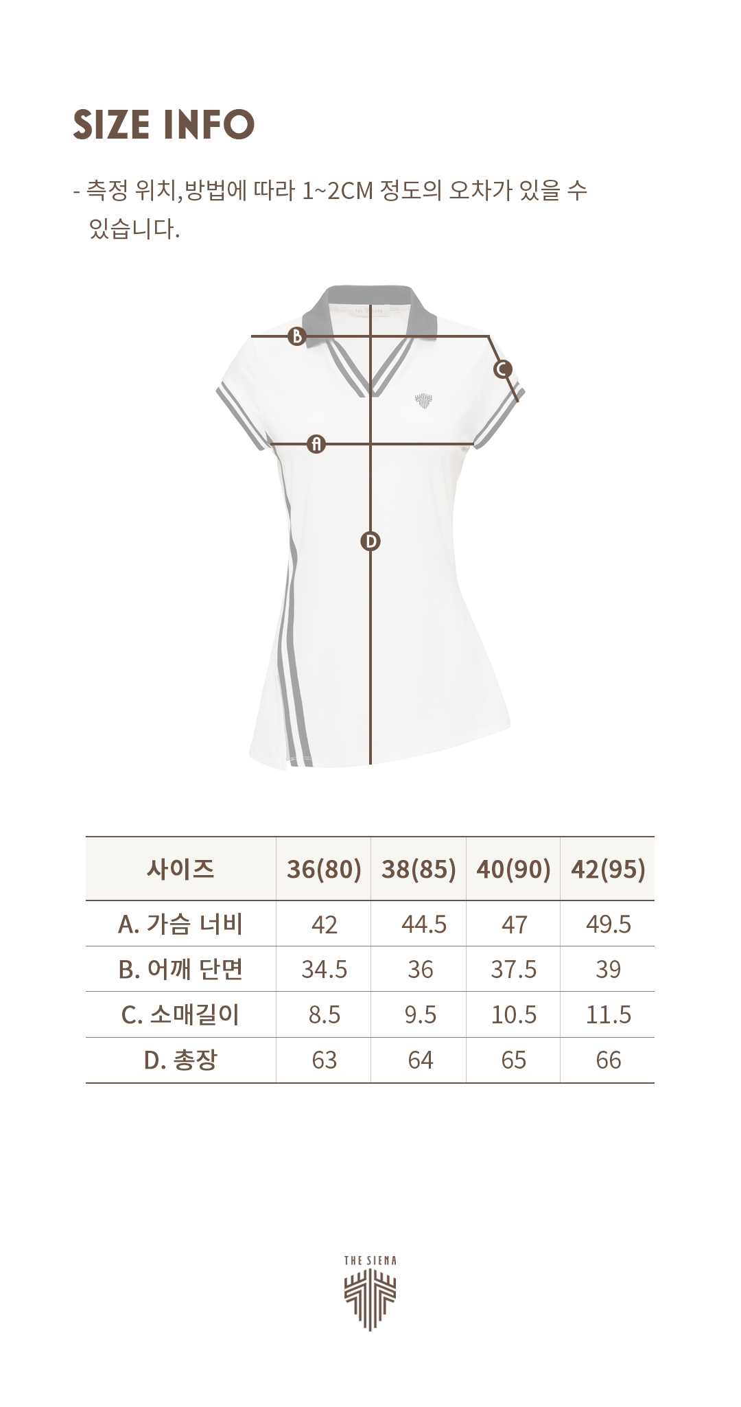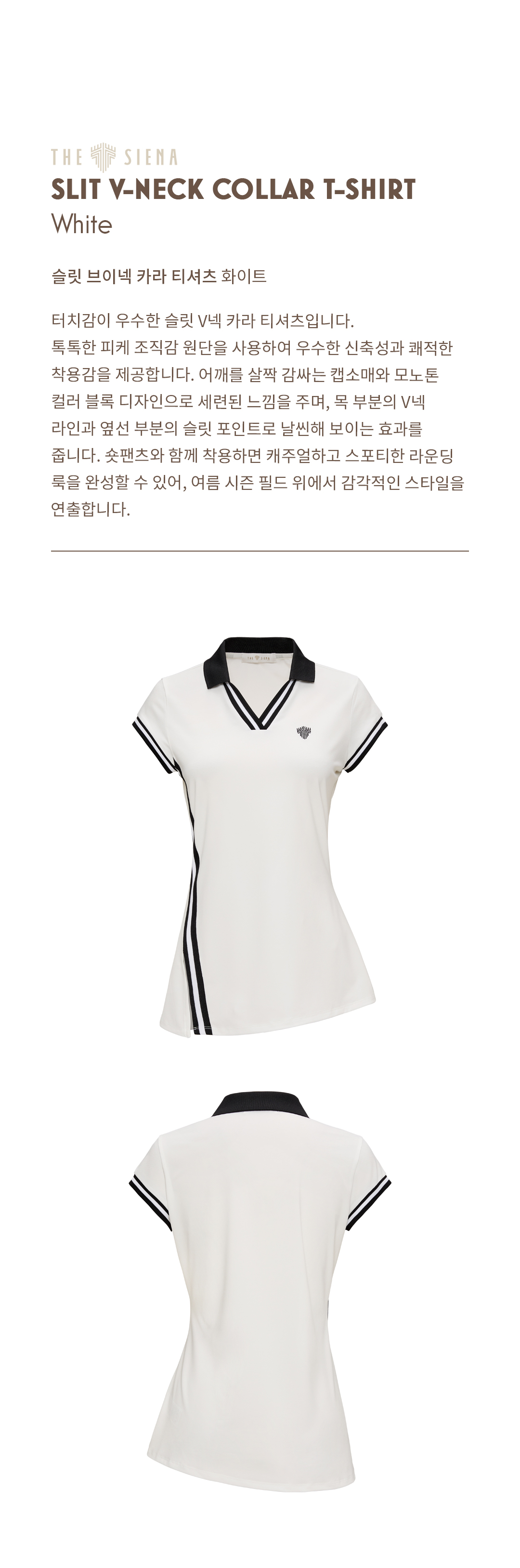 어깨를 살짝 감싸는 캡소매와 모노톤 컬러 블록 디자인으로 세련된 느낌을 주며, 목 부분의 V넥 라인과 옆선 부분의 슬릿 포인트로